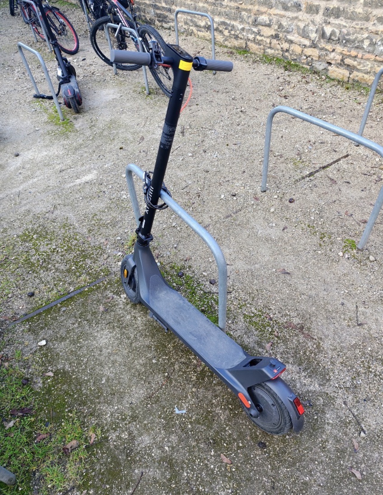 Des autocollants réfléchissants en arc de cercle de couleur orange figurent de chaque côté de la trottinette